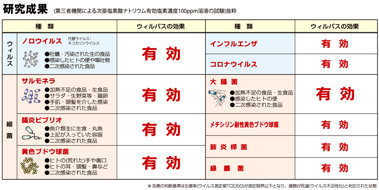 ウィルバスは、「次亜塩素酸ナトリウム」という成分を使った除菌剤。