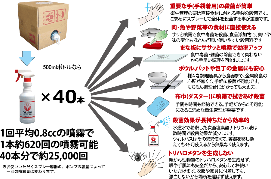 また、希釈濃度によってはウイルス性胃腸炎などの際の吐しゃ物の処理にも使用することができるとのことです。